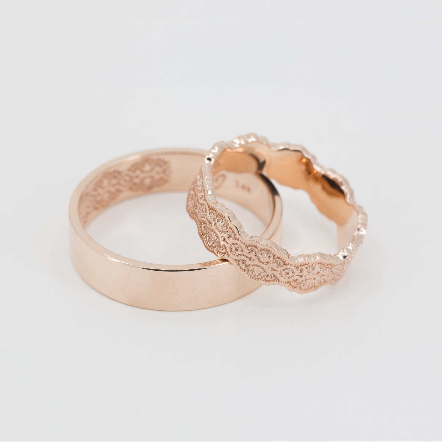 This unique matching wedding ring set for couples is comprised of our Aria lace wedding band for her and a matching wedding band for him. Her wedding ring is crafted with a beautiful lace pattern on the outside, while his wedding ring hides the same lace pattern on the inside with a classic wedding band look on the outside.