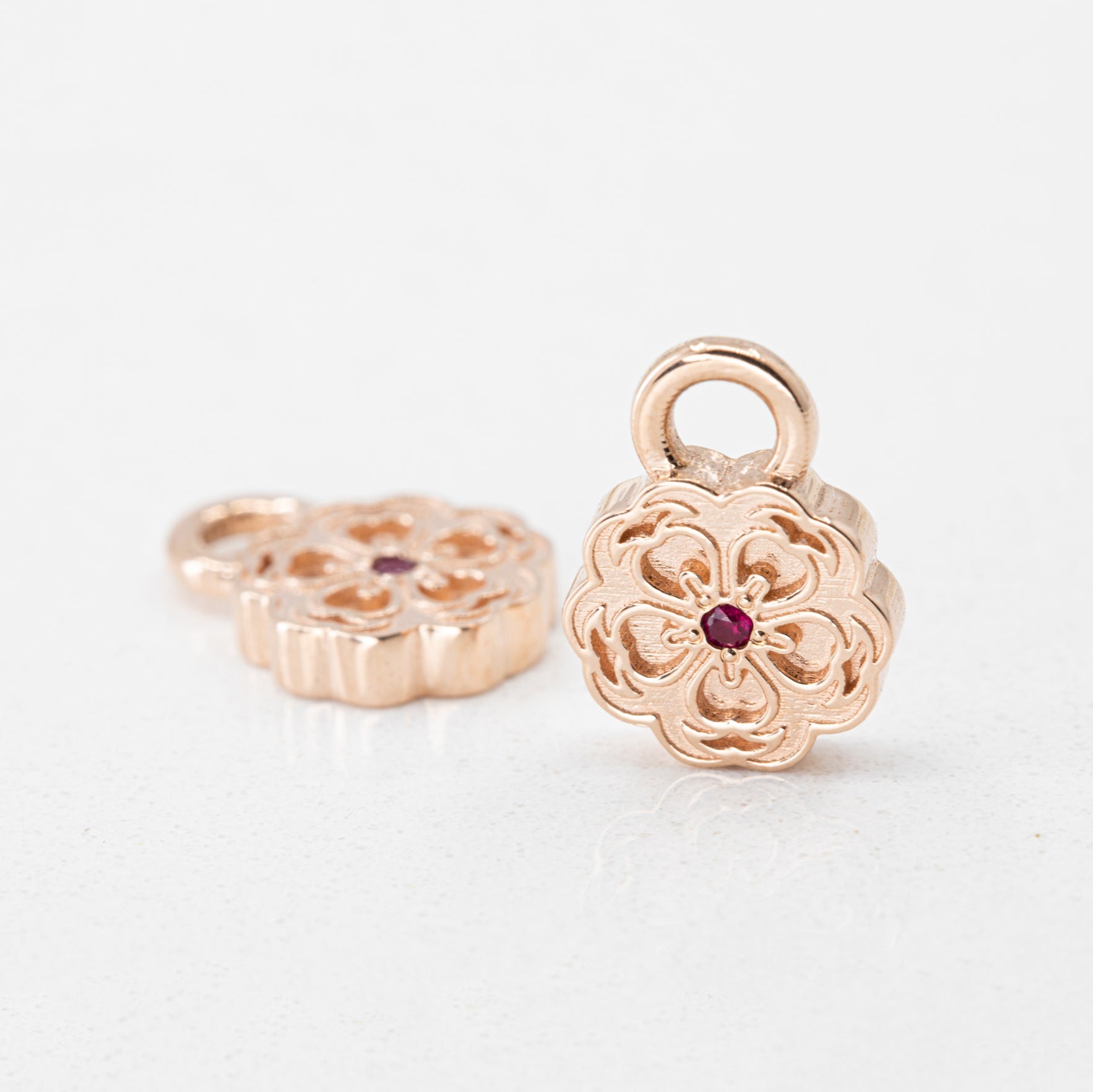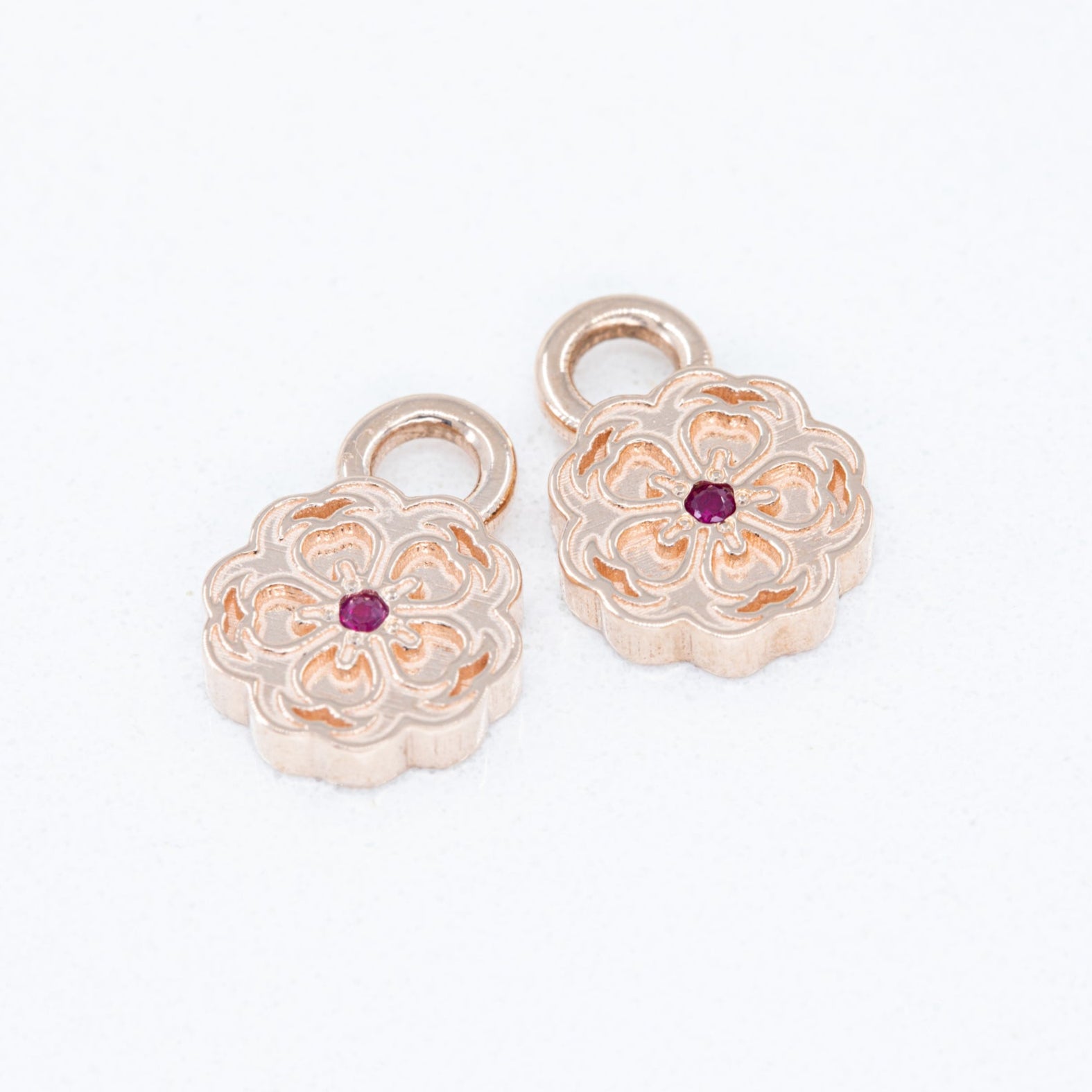 These unique earring charms are crafted with a beautiful Sakura flower and set with a single natural ruby in the center of each charm. These Cherry Blossom charms are a great way to add