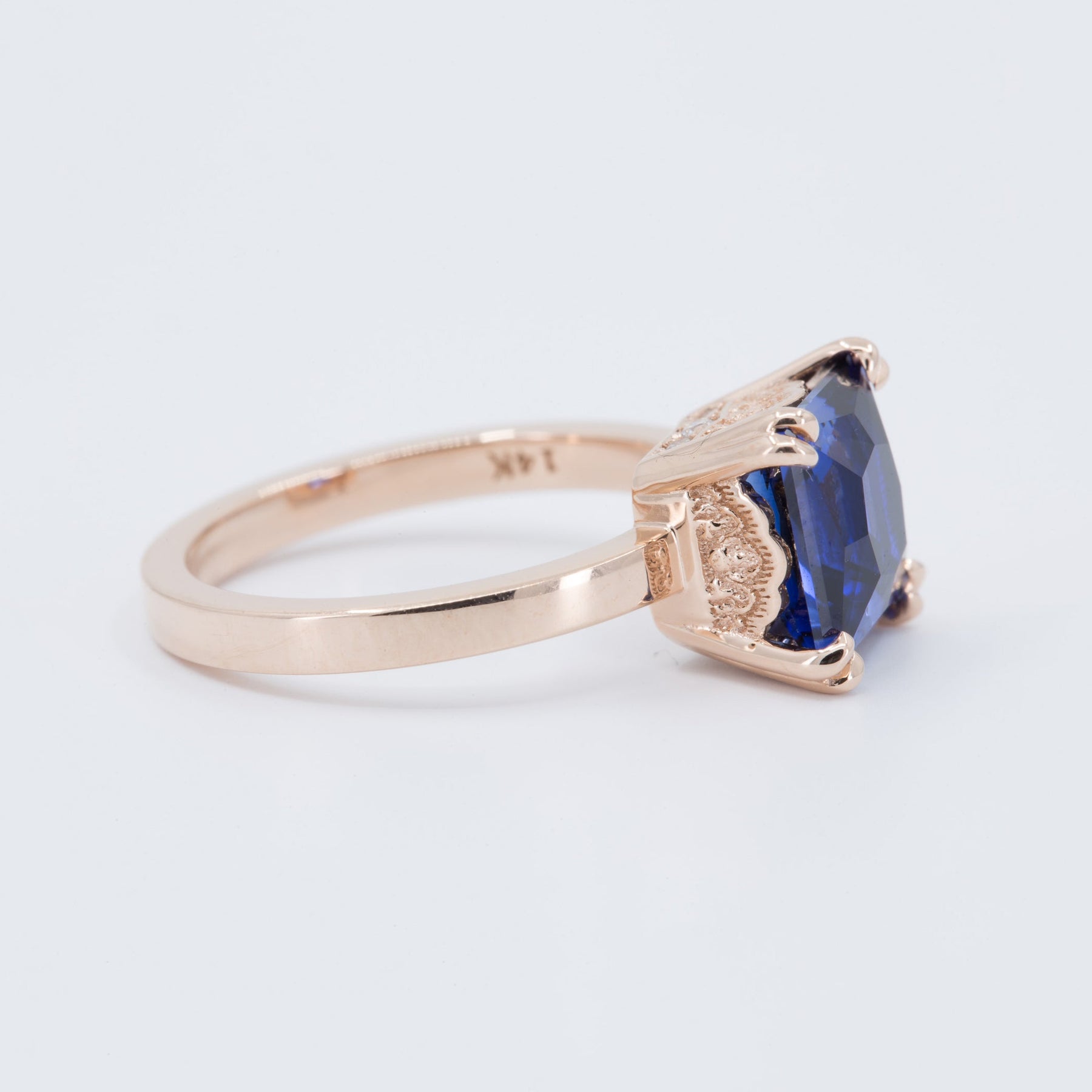 Noa is a masterpiece of subtle romance and intricate detail. At its heart, a princess cut sapphire. Beneath the center stone, a hidden lace design adds a touch of secret artistry with natural diamonds adding more sparkle. Thoughtfully designed, this piece reveals its most enchanting details only to those who look closely.