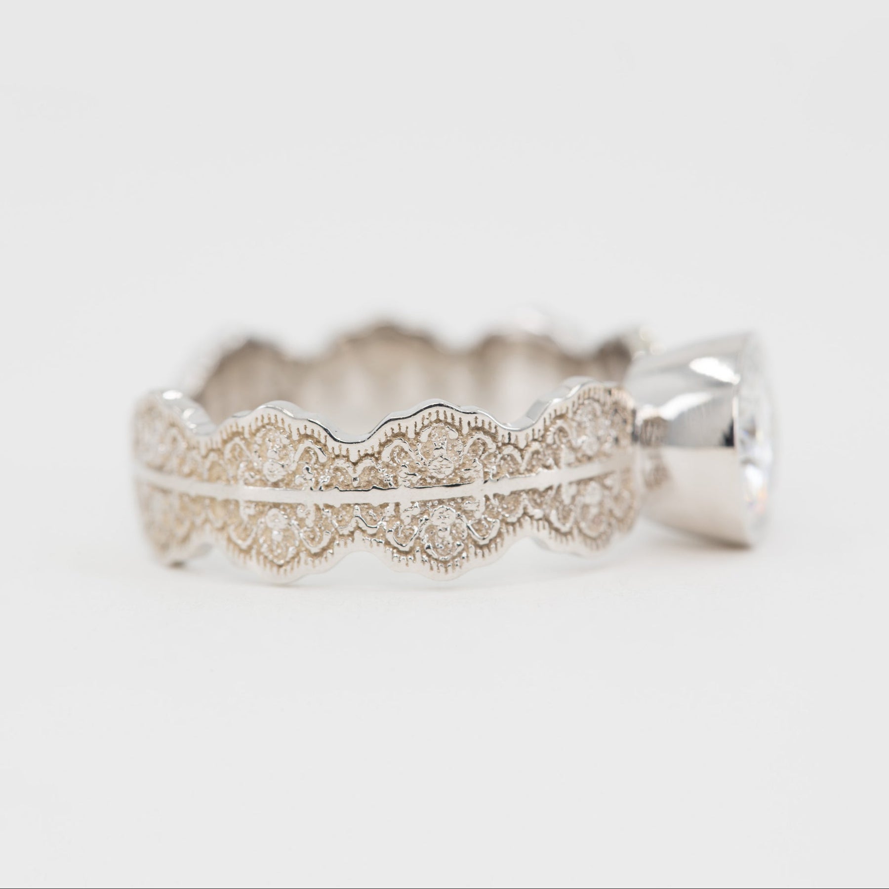 Esme showcases a striking blend of classic form and modern refinement. A round diamond is set in a sleek full bezel, radiating brilliance and security. The 6mm wide band is adorned with intricate lace-inspired engraving, adding delicate texture and visual depth.