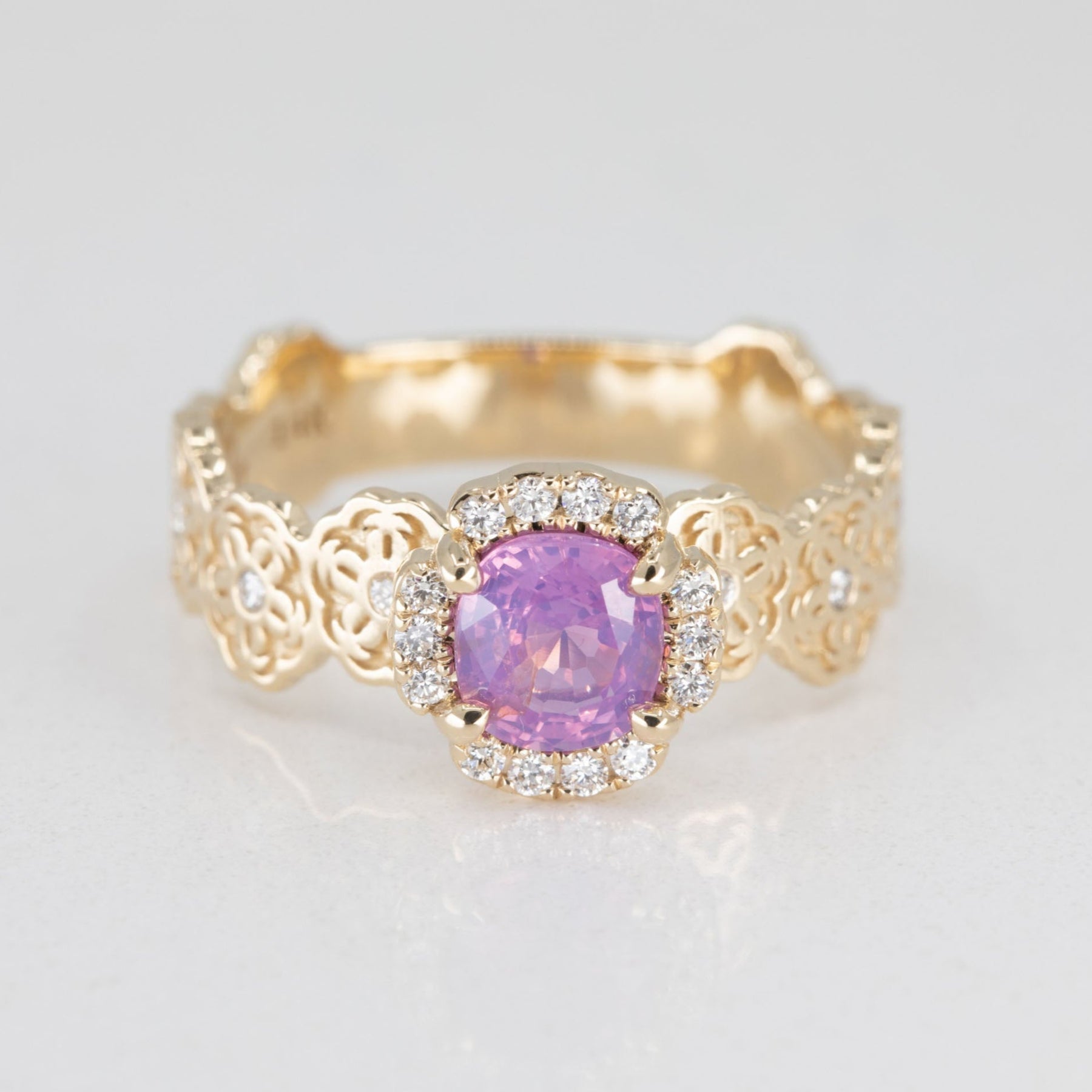 Sakura, a romantic tribute to springtime beauty, is inspired by the Japanese Cherry Blossom. This unique engagement ring is adorned with an intricate flower pattern that forms graceful scalloped edges along the band. Each blossom measures 4 mm and is accented by shimmering diamonds for a touch of brilliance. At the center rests a glowing pink opalescent sapphire framed by a natural diamond halo, adding sparkle and depth to this nature-inspired design.