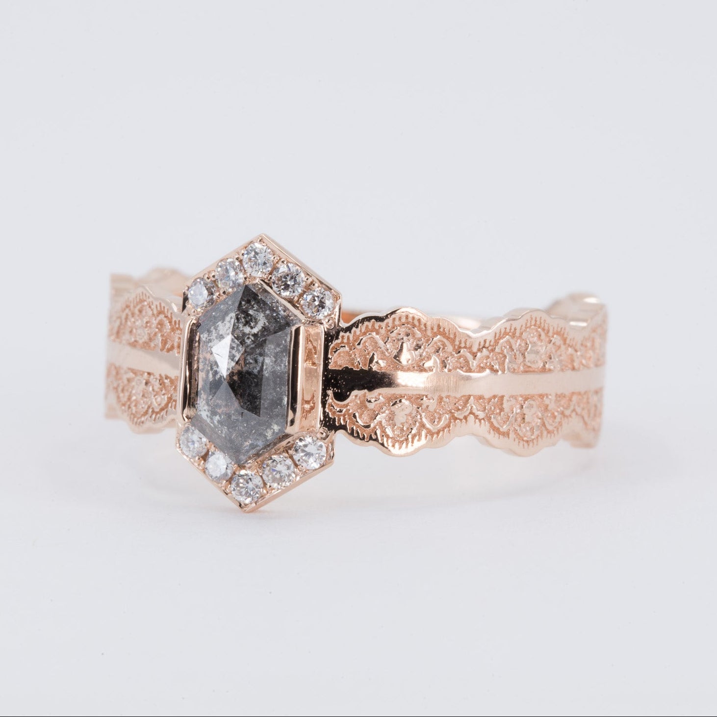 Esme features a salt and pepper hexagon rose-cut diamond framed by pavé-set diamonds that highlight its striking geometry. The lace-textured 6mm band adds refined intricacy, softening the bold structure with delicate detail and timeless grace.