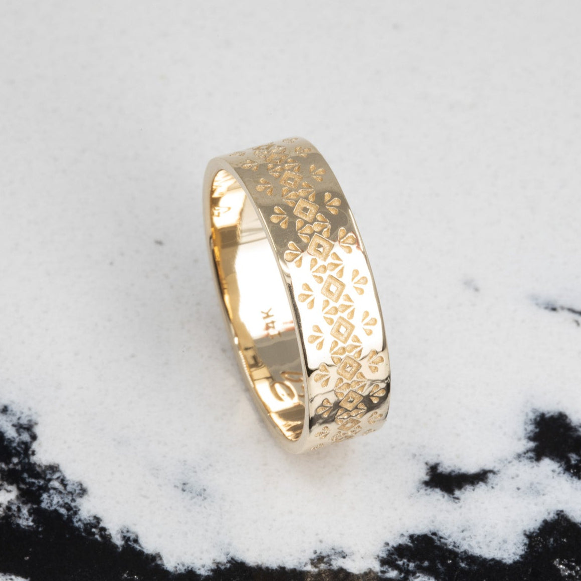Soren features a bold, precision-carved pattern of squares and teardrops, giving the ring a sharp, architectural character and a uniquely striking presence.