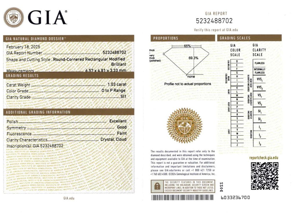 This is a GIA certified (5232488702) natural diamond O-P in color and SI1 in clarity and measuring 6.57mm x 4.81mm x 3.33mm.