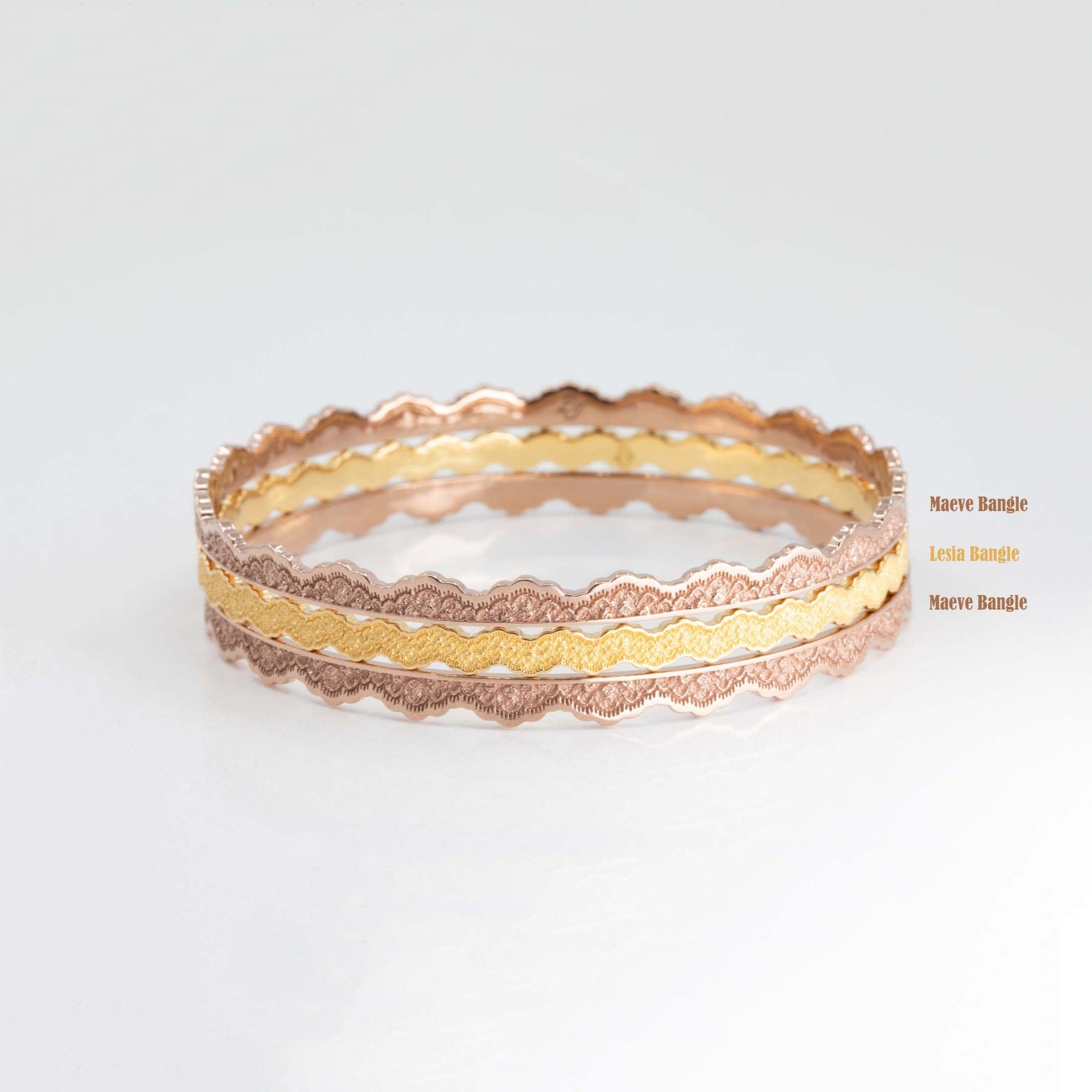 This set of three stackingbangle bracelets includes our beautiful Lesia Lace Bracelet and two MaeveLace Bracelets. Each bracelet is made in solid gold and designed to turn heads. The lace-inspired patterns brings a refined mix of elegance, originality, and style. Wear each one alone for a standout piece, or stack them together to express your individuality.