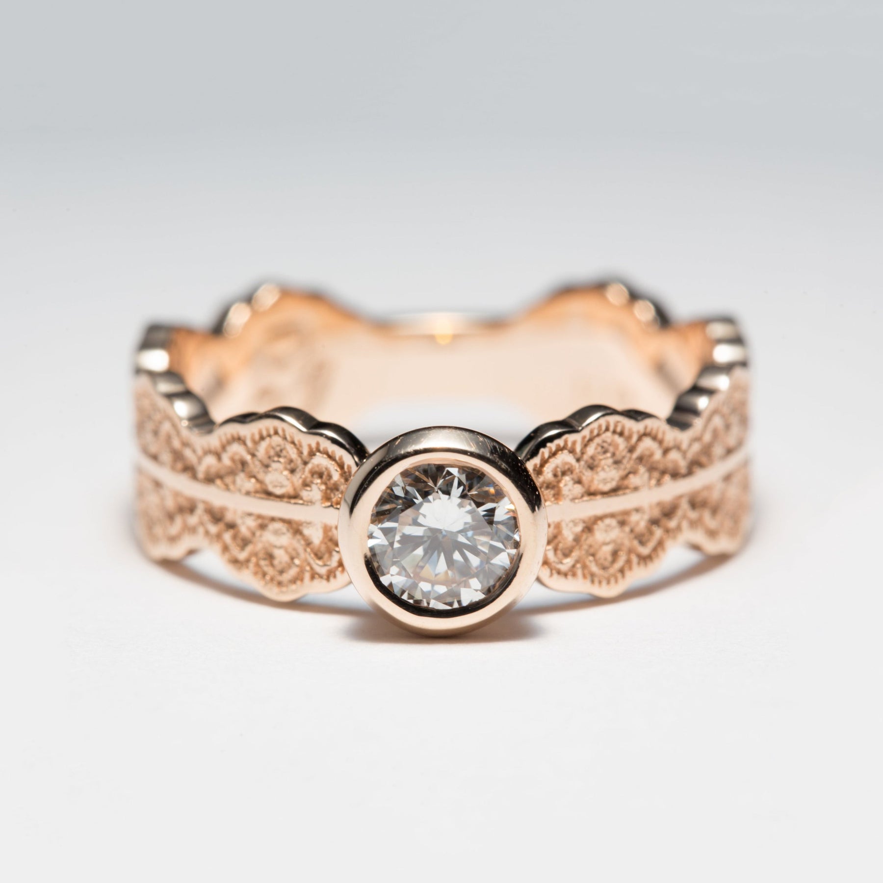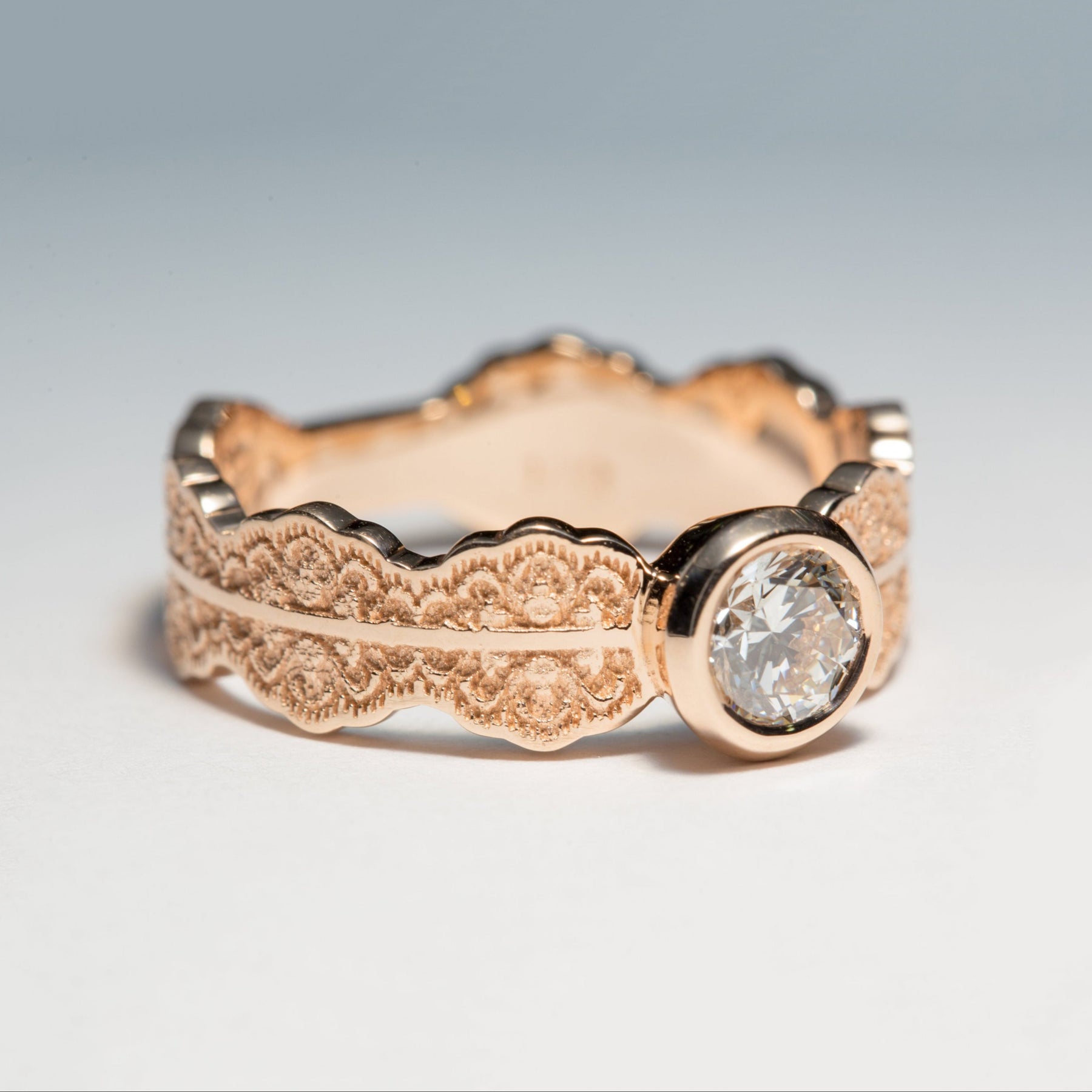 Esme is an elegant lace solitaire engagement ring, expertly crafted in solid 14K rose gold. The lace design is beautifully scalloped on both edges, adding texture, movement, and a romantic touch. At its heart lies a 0.50 carat GIA certified round brilliant diamond graded H in color and VS2 in clarity. With its refined details and sparkly center diamond, Esmeoffers a strikingly unique expression of timeless beauty and personal style.