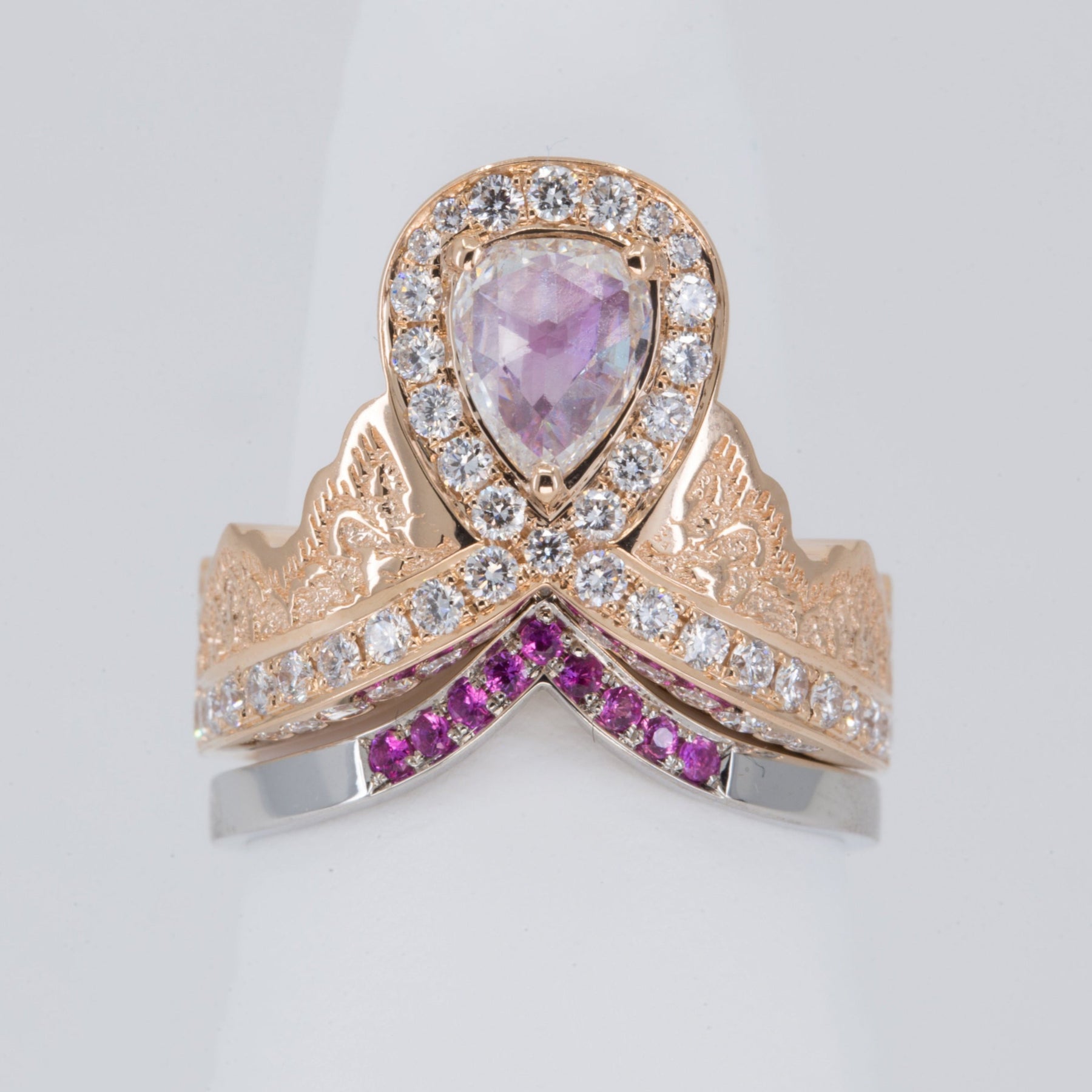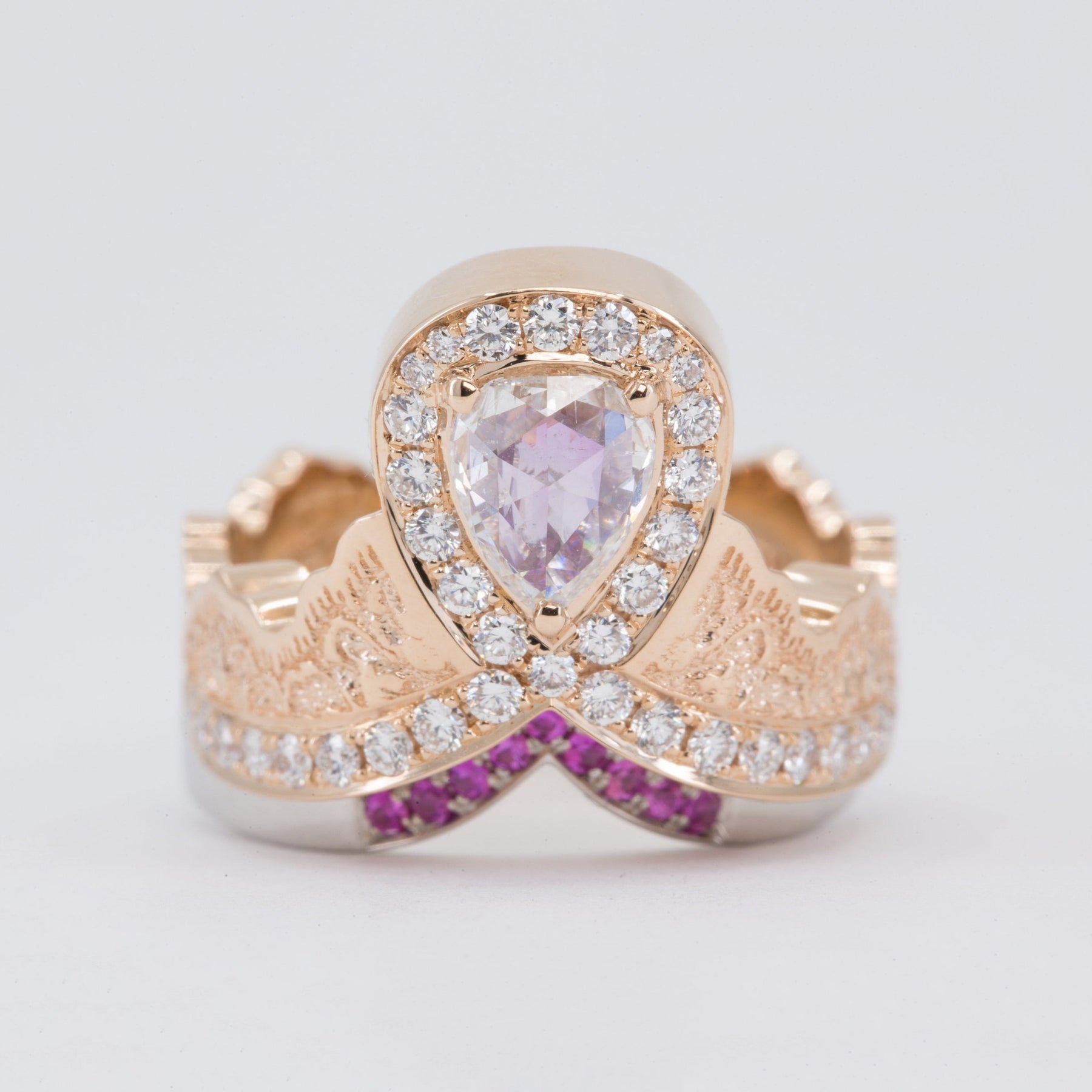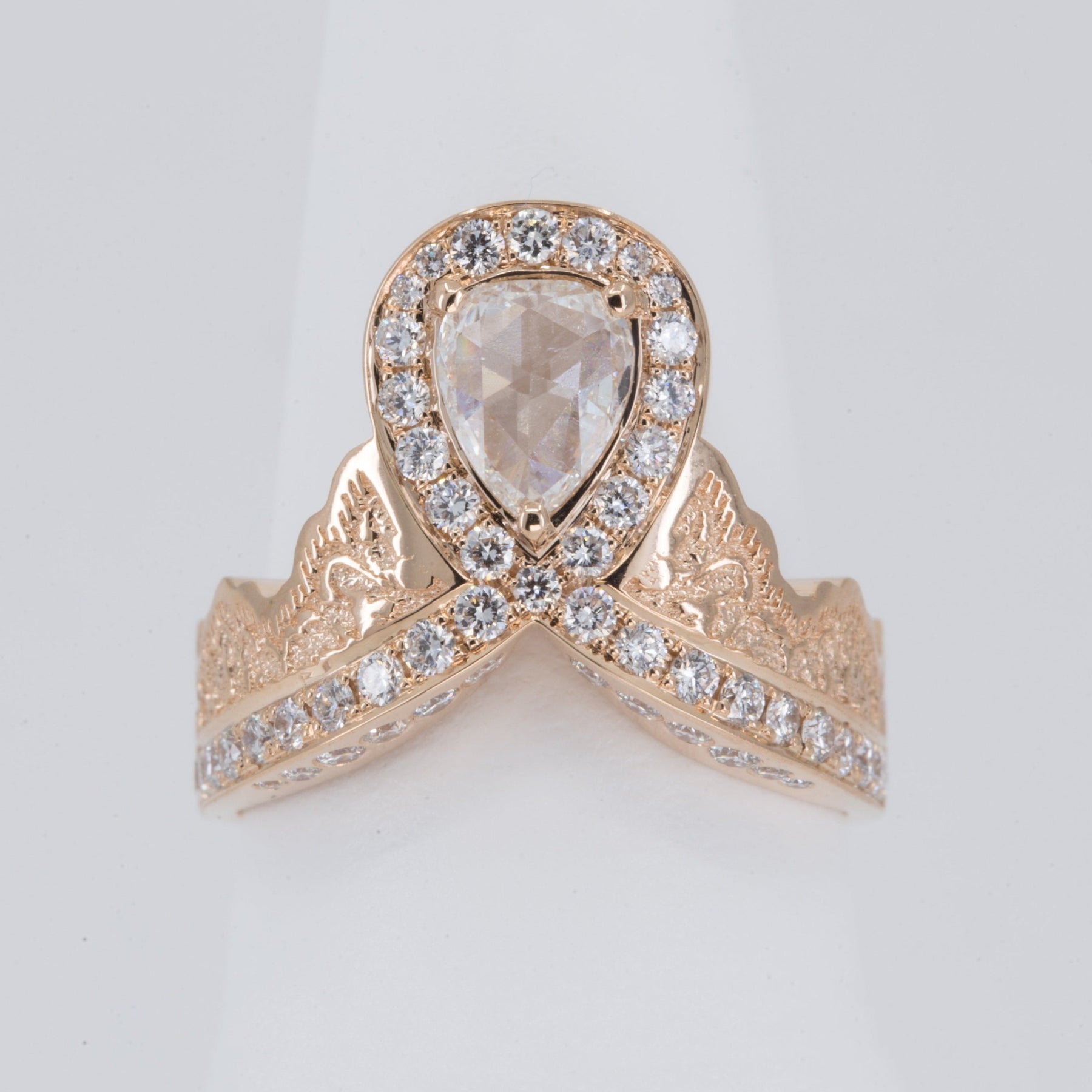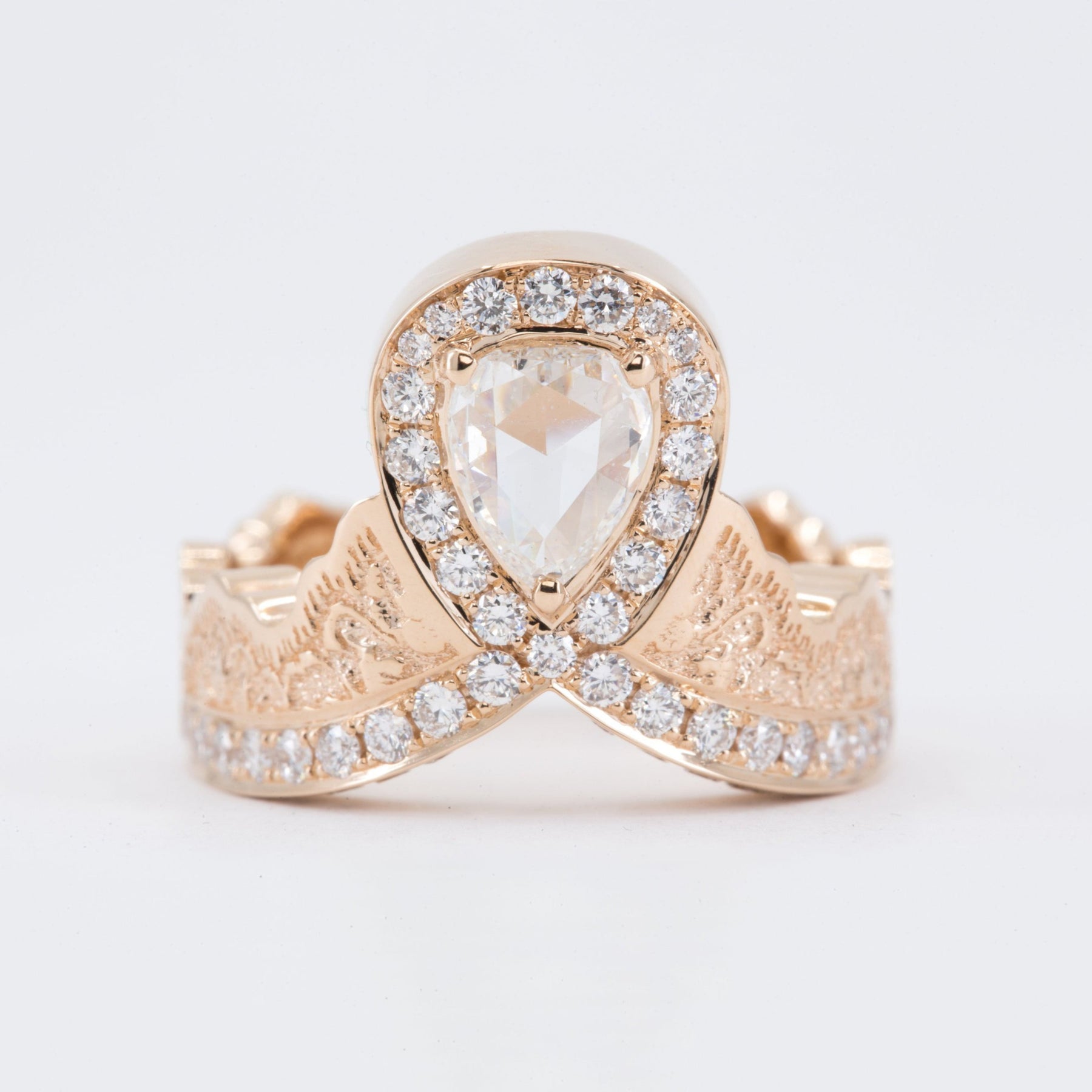 If you are looking for something different, look no further. Unique like no other, this ring set will turn heads with its sparkly 0.52ct rose cut pear shaped diamond accented by a diamond halo that flows down the edge of the intricate, delicate and feminine 14K rose gold lace band.