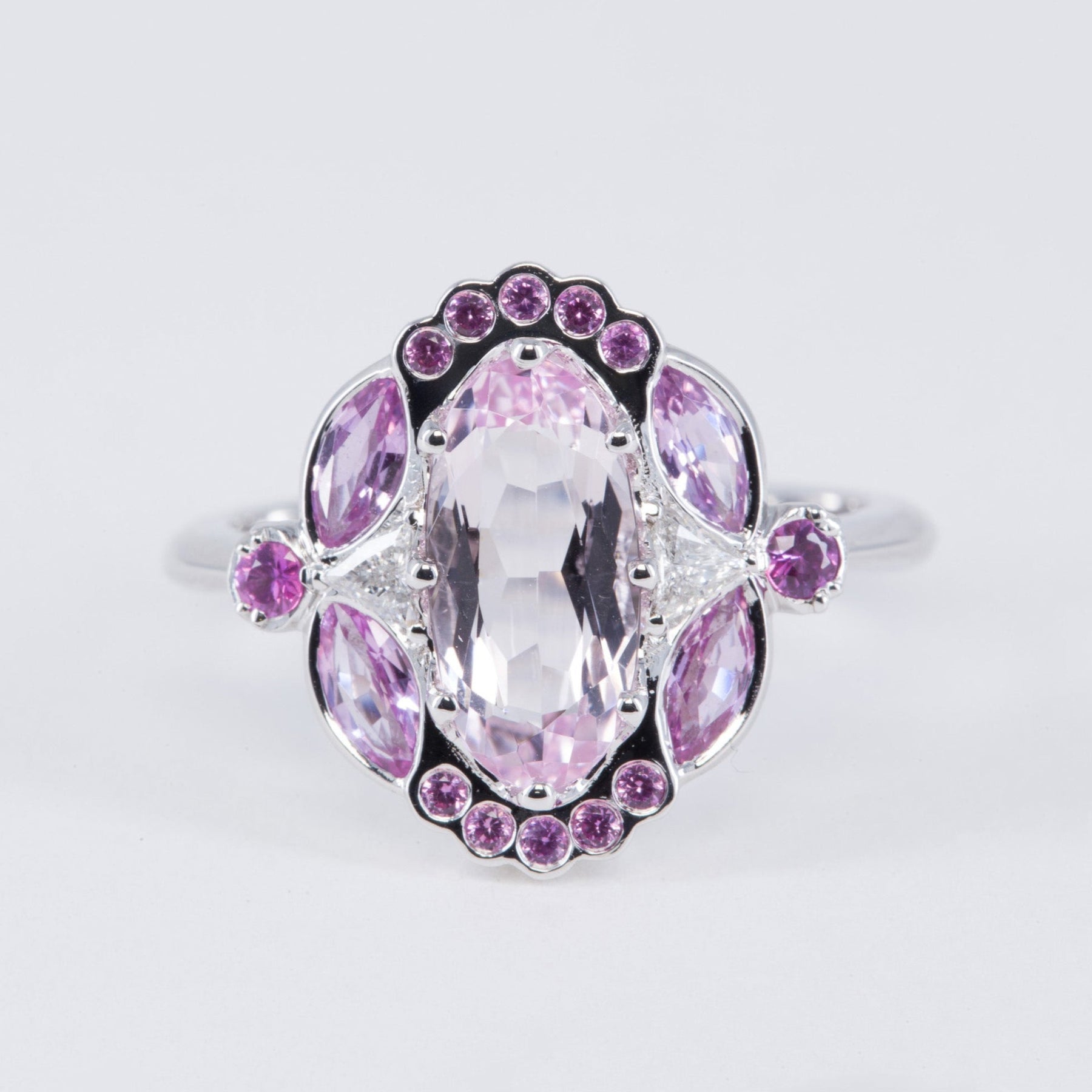 This beautiful and unique 14K white gold engagement ring is set with an elongated 1.36ct pink morganite, flanked by two trillion diamonds - one on each side - along with four marquise shaped pink sapphires and two round pink sapphires. A semi-halo of small pink sapphires adorn the morganite from north to south.