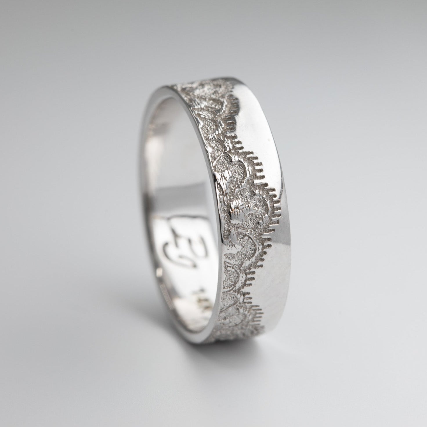 Esti is a modern reinterpretation of the classic wedding ring, featuring an elegant lace texture that flows gracefully along one side of the band in a continuous, delicate pattern. This thoughtful asymmetry adds a touch of contemporary artistry while honoring timeless design, making Esti a refined and distinctive choice for a wedding band.