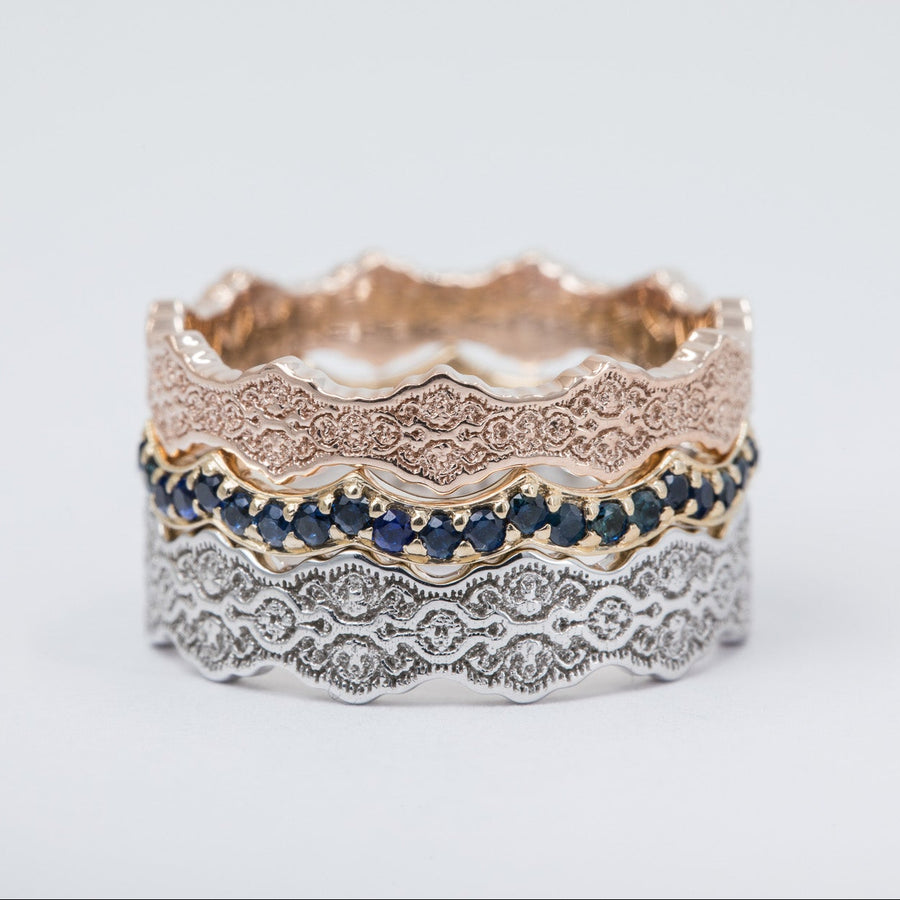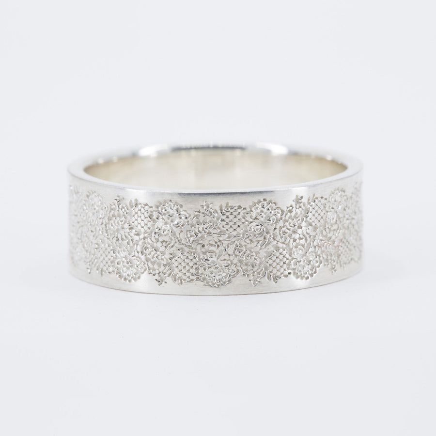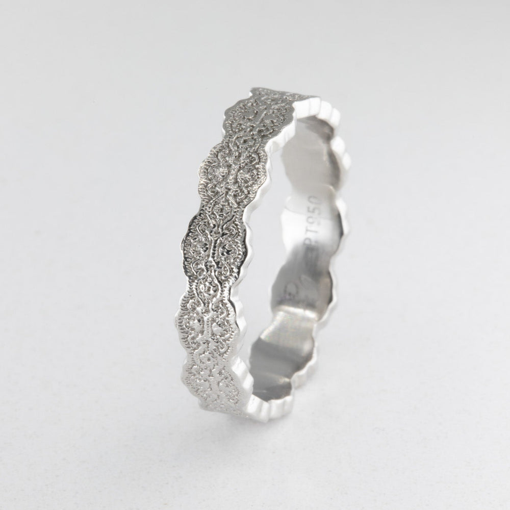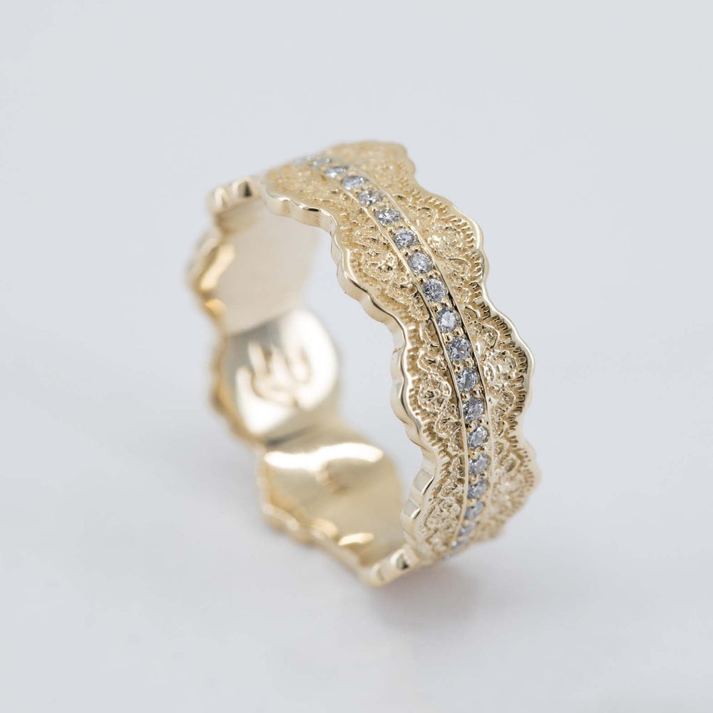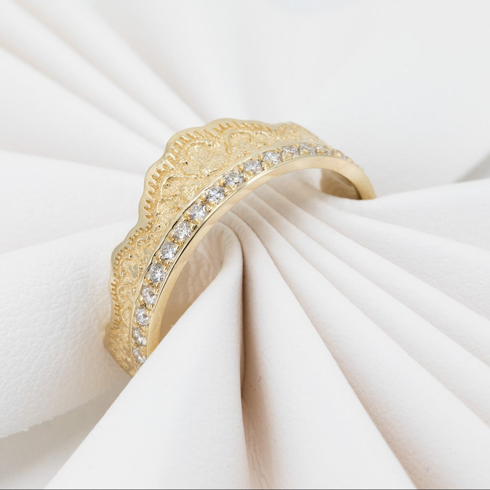 Celebrate your forever with our lace-inspired wedding bands, crafted with delicate details that echo vintage lace patterns. These romantic designs add a timeless, elegant touch—perfect for stacking or wearing solo.