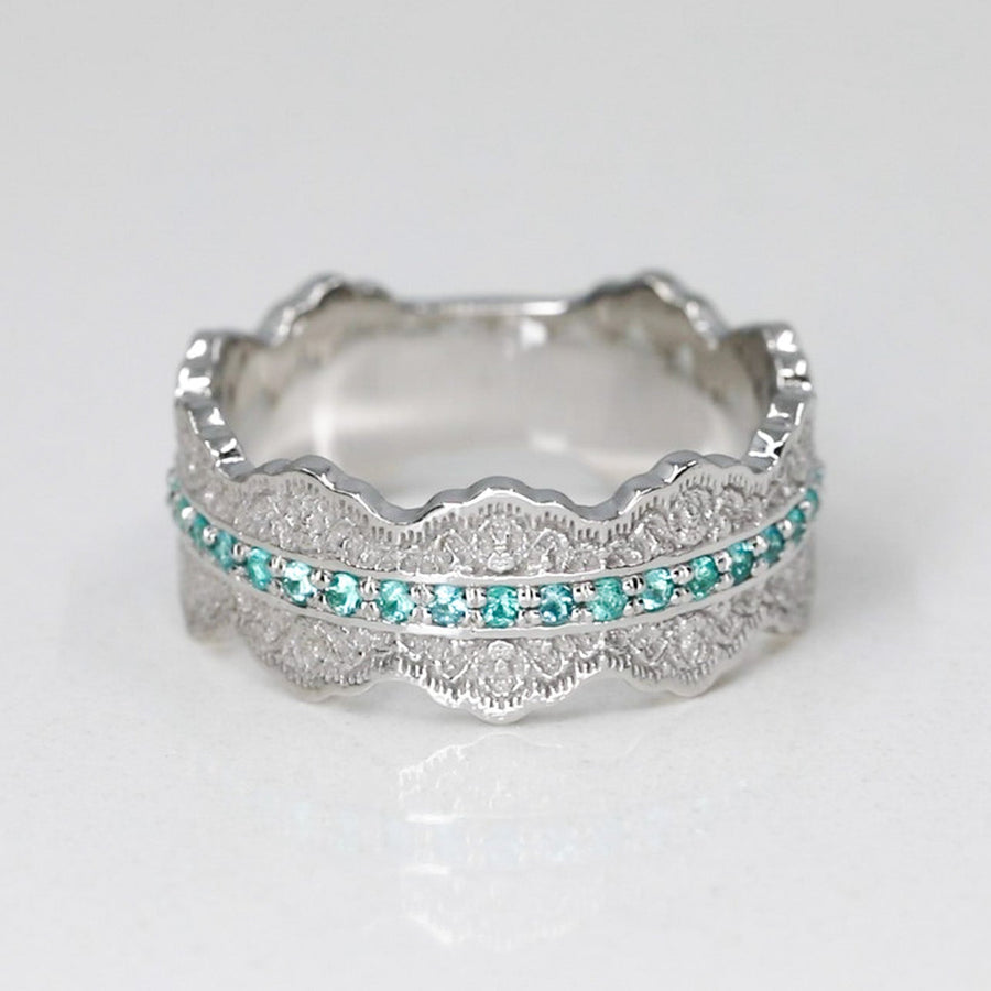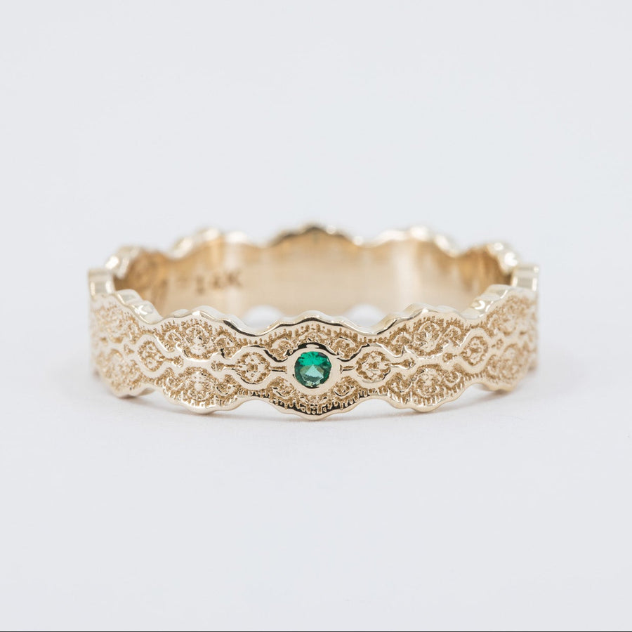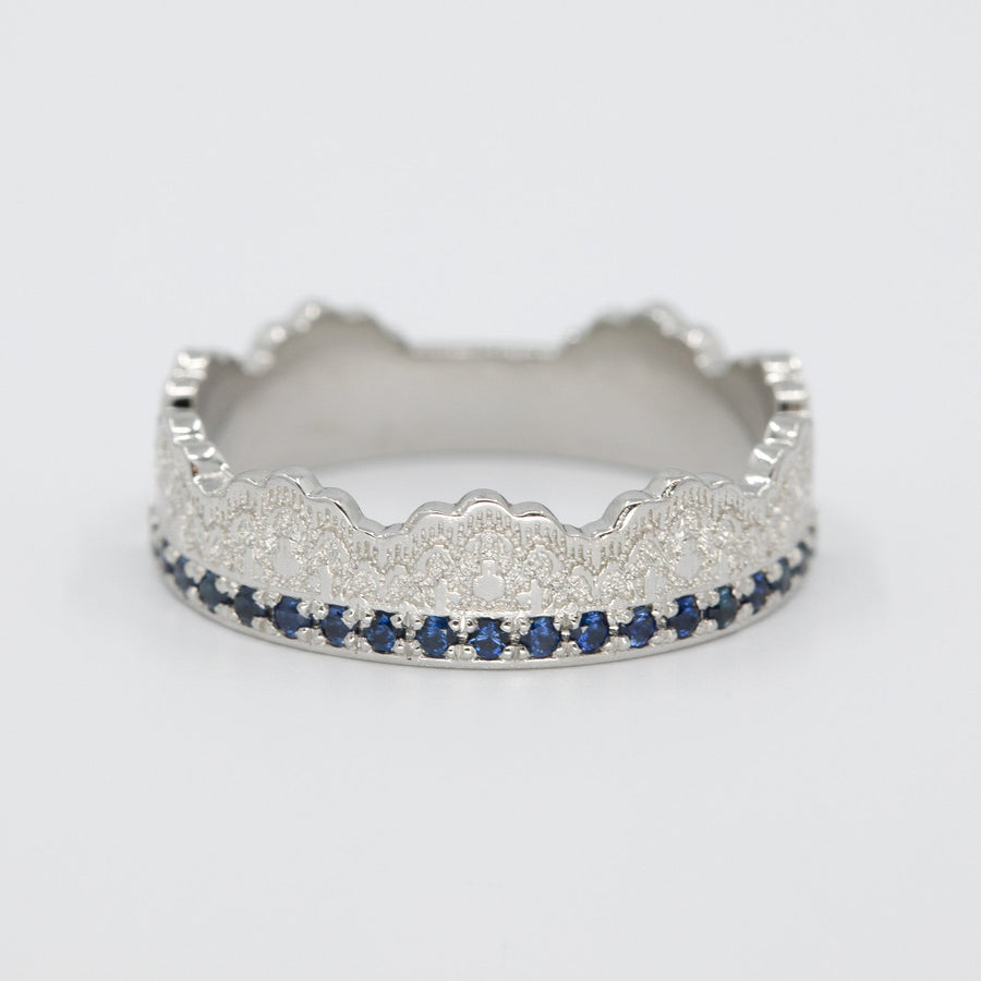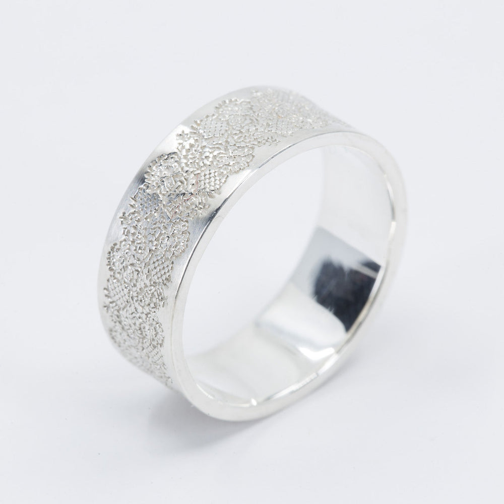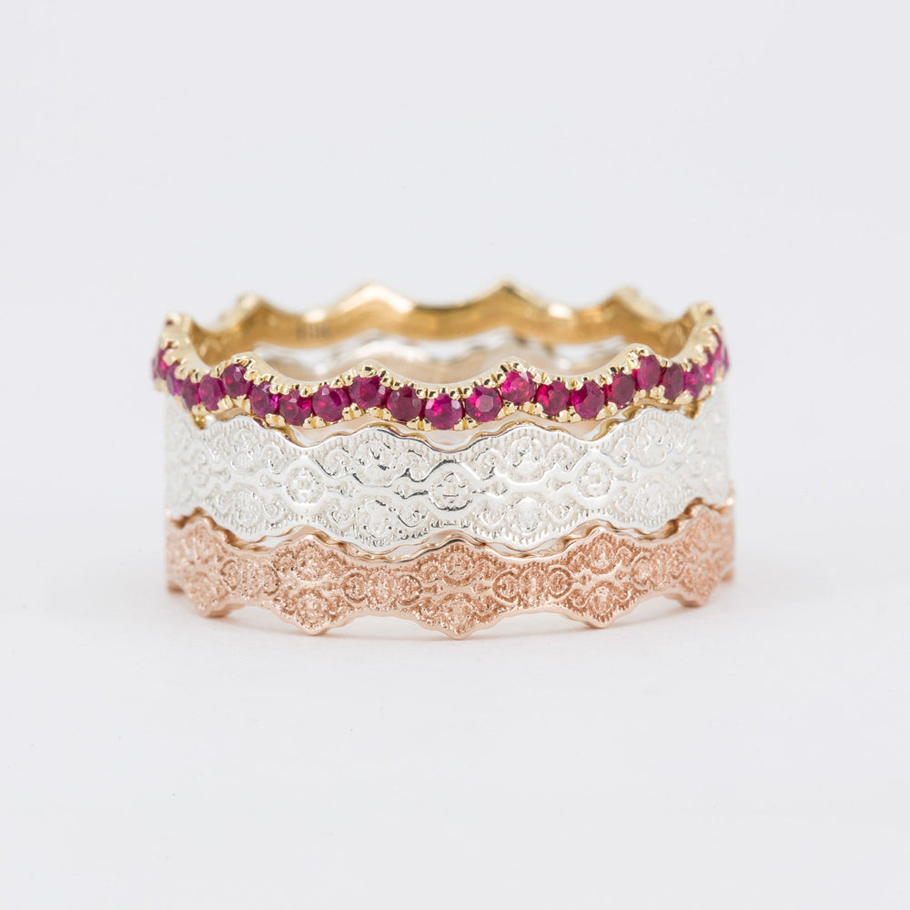 Celebrate your forever with our lace-inspired wedding bands, crafted with delicate details that echo vintage lace patterns. These romantic designs add a timeless, elegant touch—perfect for stacking or wearing solo.