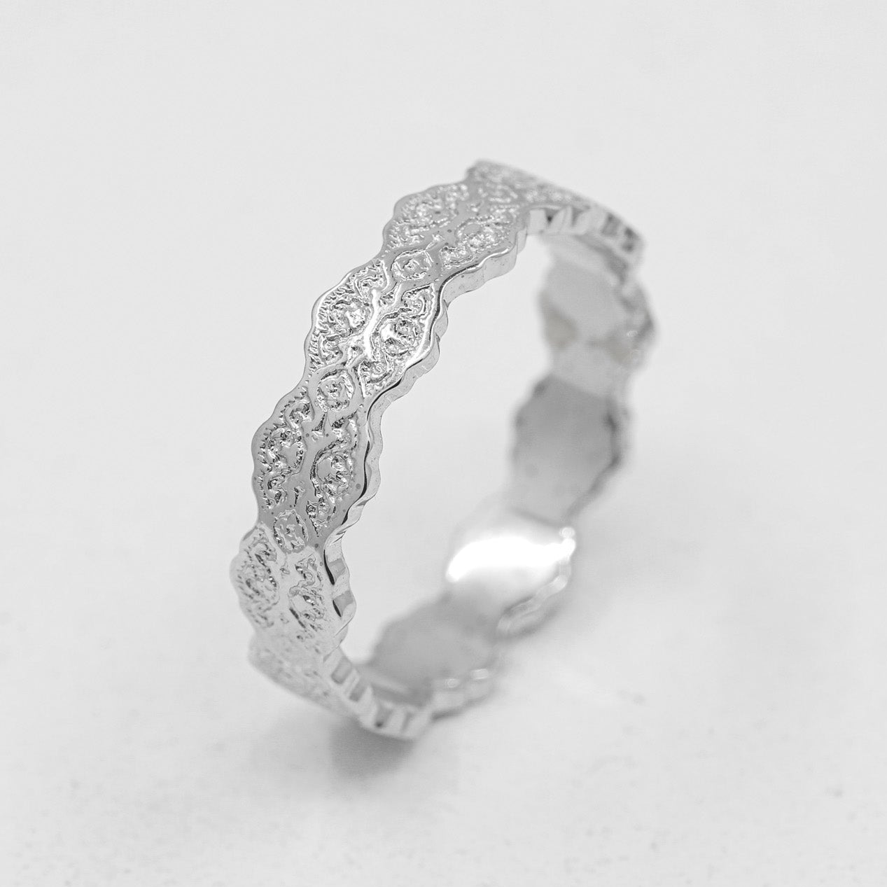 Aria is a striking wedding band exquisitely crafted with an intricate lace pattern. The elegant lace detailing adds a romantic, vintage-inspired touch to this unique modern design.