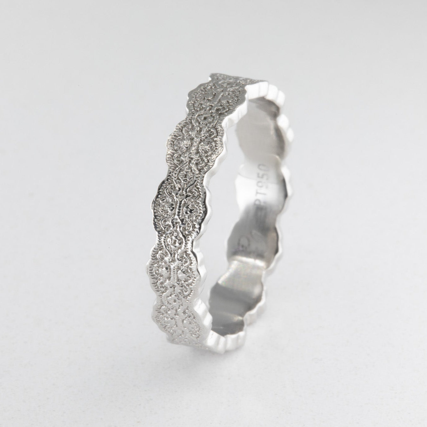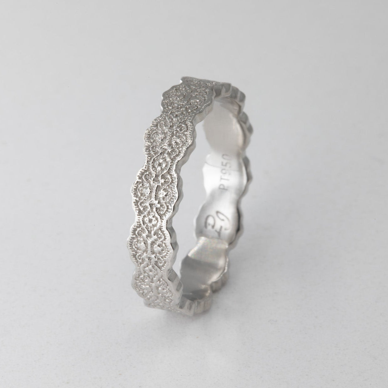 Aria is a striking eternity wedding band exquisitely crafted with an intricate lace pattern which adds a romantic, vintage-inspired touch. This unique, beautiful ring is made in platinum.