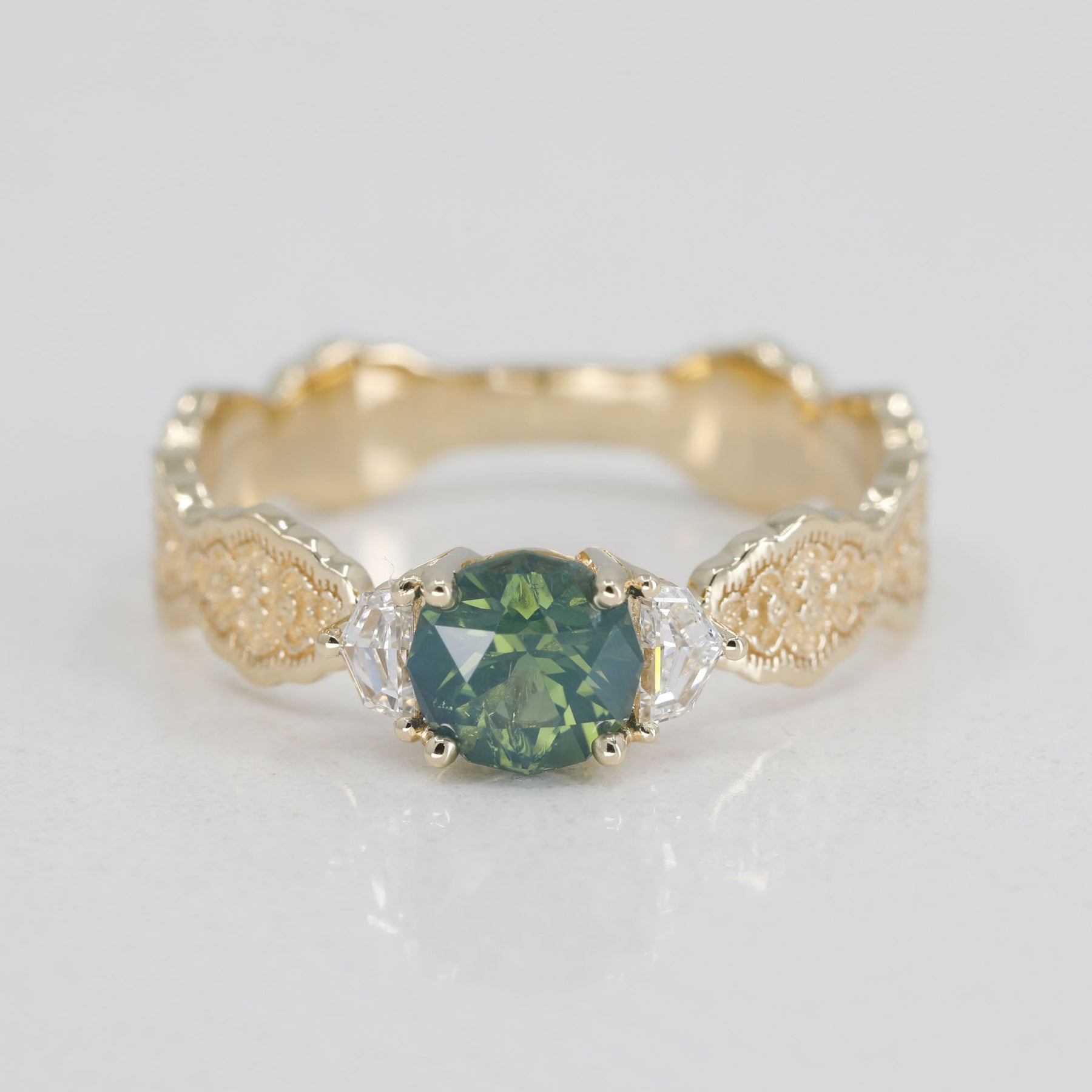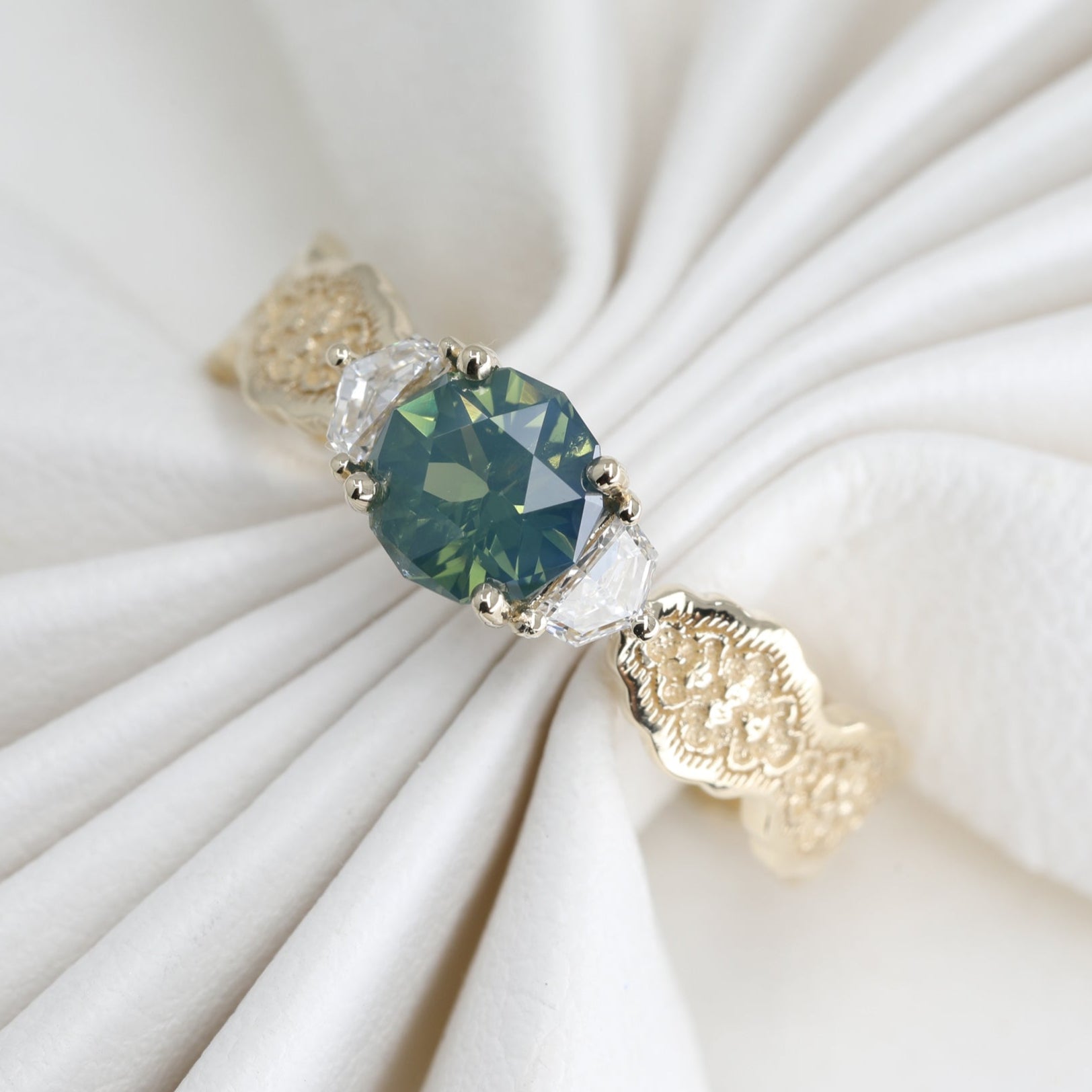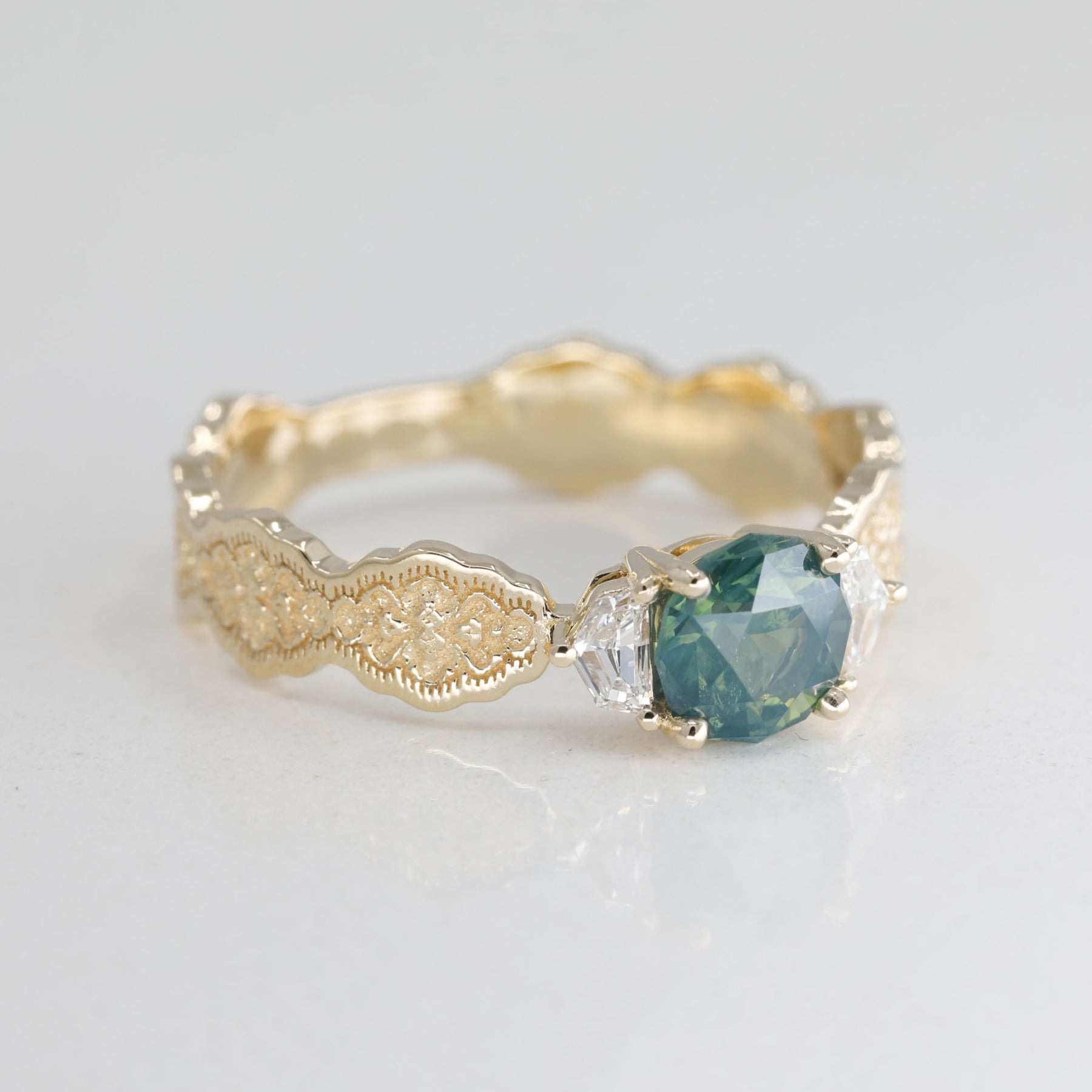 Brynne is a striking blend of vintage elegance and bespoke artistry. Its intricately crafted lace band evokes the delicate beauty of fine textiles, with details that catch the light from every angle. At the center rests a custom-cut round sapphire, chosen for its rich, mesmerizing opalescent green color and unique faceting that sets it apart from traditional cuts. On each side, a Cadillac cut diamond adds sharp, architectural brilliance — a sophisticated contrast to the sapphire’s deep color and the band’s romantic lacework. The result is a one-of-a-kind piece that balances softness and structure, artistry and precision, in perfect harmony.